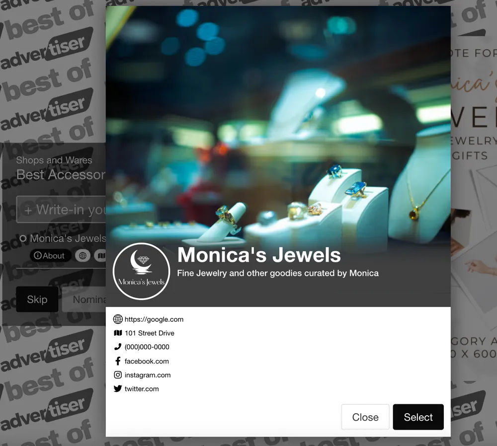Use this unit to remind readers to nominate for you, or simply to get in front of this hyper-local audience. Ad unit that appears next to a selected listing during nominations. (Ex. Best Brewery) On desktop this ad appears to the right of the nomination form. On mobile this appears on the top of the nomination form. Ad will link to your website. These ad units are Share of Voice (up to 3 ads available per category).