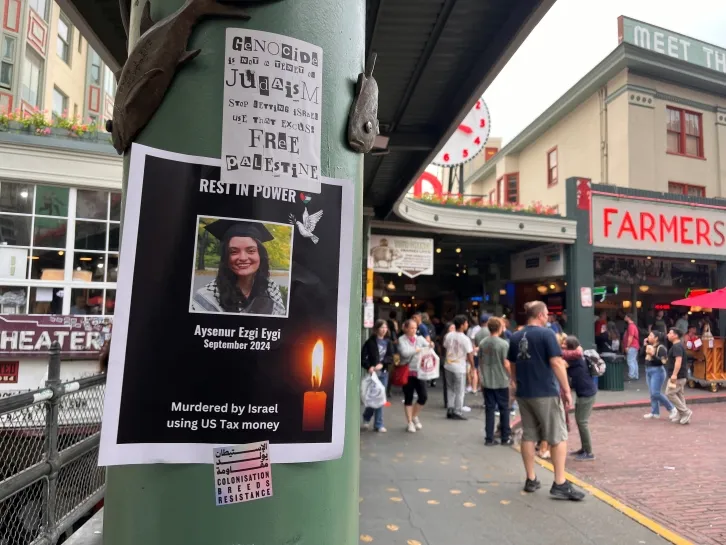 On Saturday, the Seattle organization Shut It Down for Palestine held a march to call for justice for Eygi and commemorate nearly one year of war. "Today is the 11-month anniversary of the genocide, but it's not just that," organizer Taylor Young said. "We also saw a beloved community member assassinated in cold blood by Israeli forces with US diplomacy as a backing, as well as US arms to make it possible. We're here to demand an end to the genocide. A ceasefire is the bare minimum. We want an end to the occupation, release [of] all the Palestinian prisoners, justice for Aysenur, and [a] free Palestine."