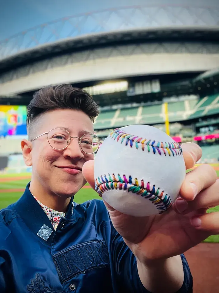 The Pride Ball, thrown as part of a ceremonial first pitch on June 4 at T-Mobile Park, represents the culmination of a yearslong passion project for Zierler. She pitched the idea, pushed it through countless conversations and meetings, and even painted the colorful thread herself, since there were no off-the-shelf ones that matched what she was looking for.