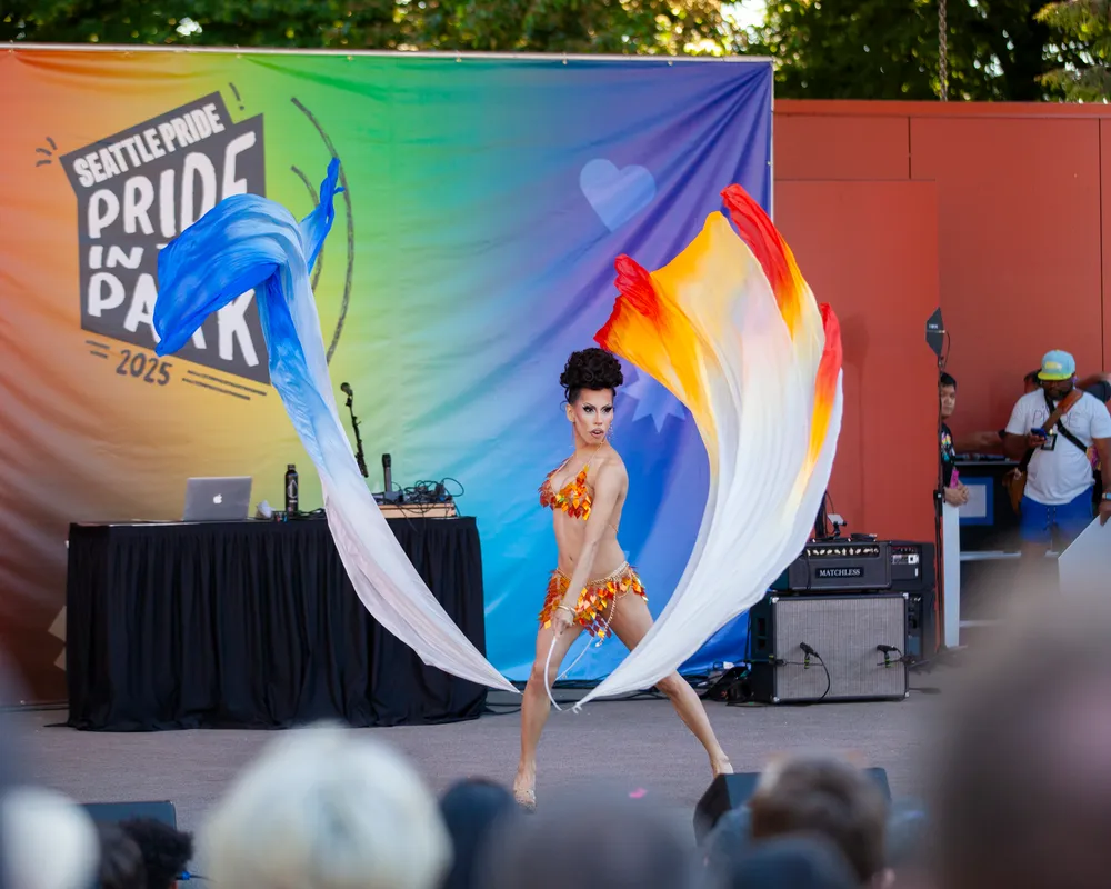 Seattle’s Pride Month festivities kicked off at Pride in the Park, with music, dancing, community booths, and more at Volunteer Park on Capitol Hill. This annual LGBTQIA2S+ celebration, with the theme of “Louder,” and emceed by Betty Wetter and Aleksa Manila, featured a can’t-miss LGBTQIA2S+ lineup: one stage featuring live performances; another was a dance-focused stage with DJs and an adjacent alcohol garden (21+). There were also food trucks, local nonprofit booths, Queer vendors, and plenty of family-friendly activities — including Drag Queen Storytime — and a teen space designed, programmed, and hosted by youth.