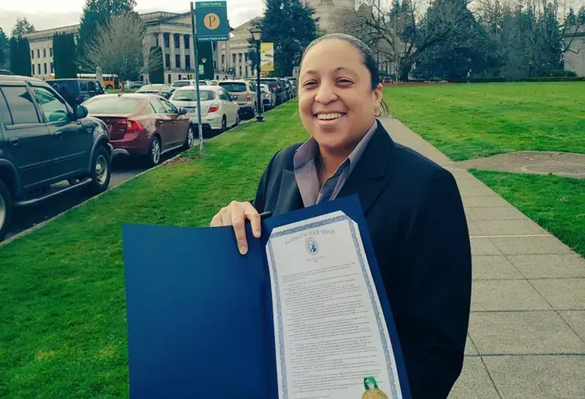 Monisha Harrell pictured in March 2020 with Senate resolution 8694 that goes along with House bill 1687 also known as the Nikki Kuhnhausen Act, which removes a legal strategy known as the LGBTQ+ panic defense -    Equal Rights WA