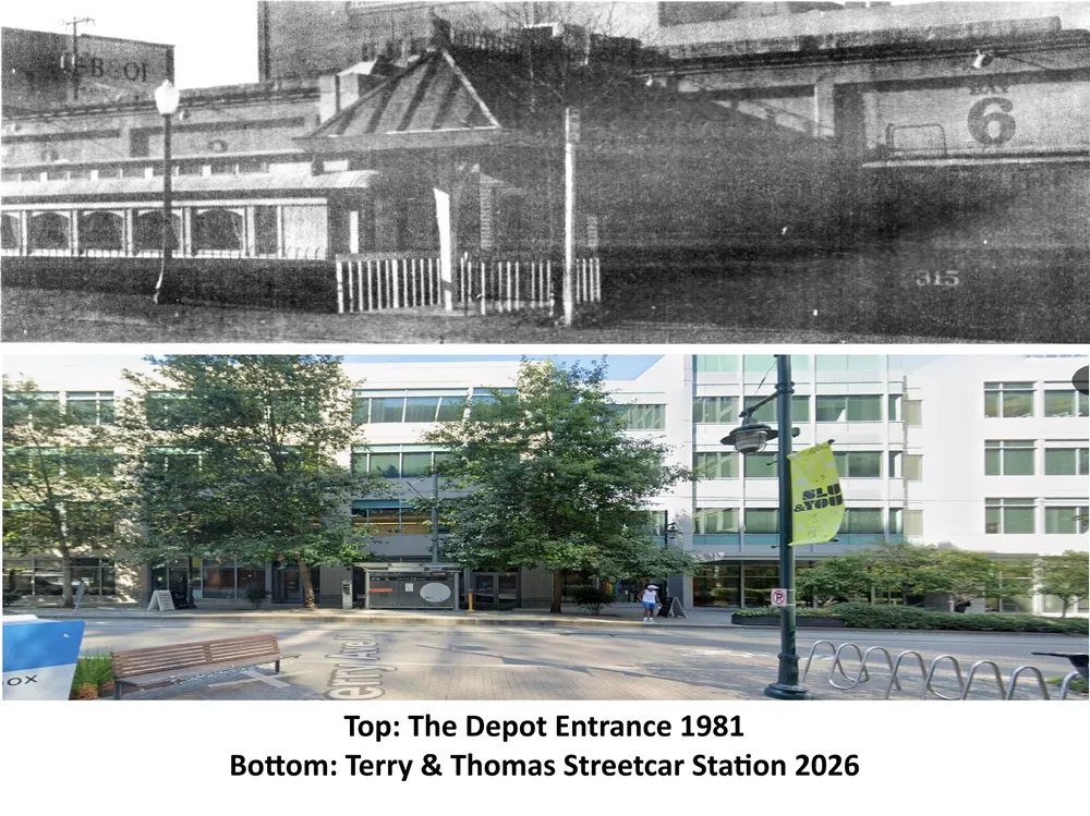 The Depot was a large entertainment complex, with over 10,000 square feet of indoor space. It stretched almost the entire block between Thomas Street to the south and Harrison Street to the north, in an old freight house, with railroad flat cars pulled alongside, left over from when South Lake Union was an important industrial area. (The entrance was mid-block approximately, in the location of the current Terry & Thomas streetcar station.) Two acres of free parking had room for over 150 cars.