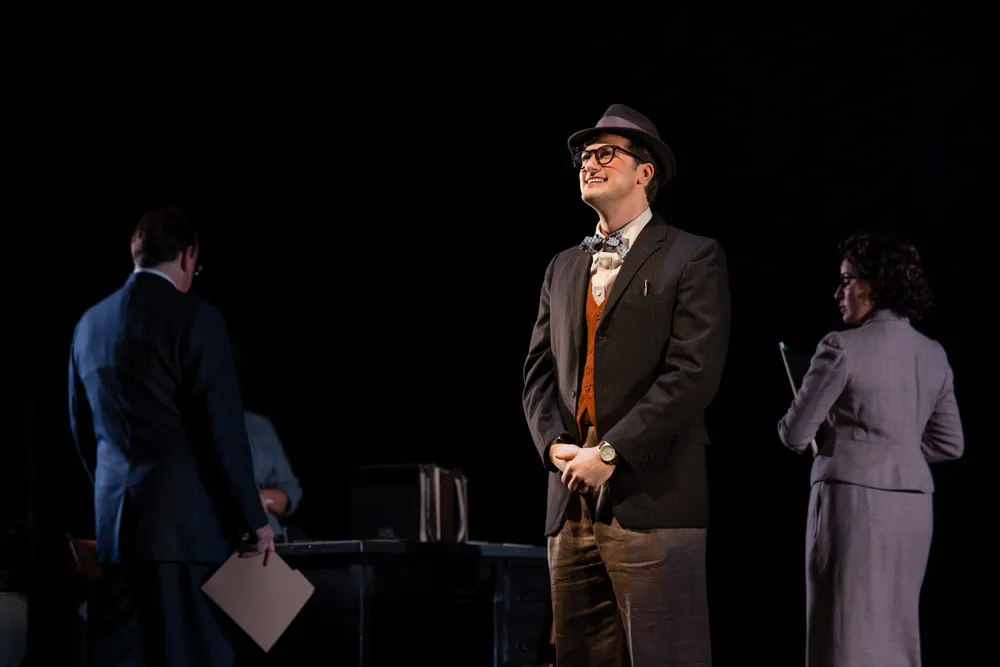 The simple, versatile set designed by Vita Tzykun provides exactly the right backdrop for the action. Newbury’s staging is inventive and effective throughout. He makes us feel Hawk and Tim’s experience of constantly being watched, constantly having to hide. Even the transitions between scenes add to the drama: when Hawk is being interrogated and subjected to a lie detector test, he answers “no” to every question about same-sex desire and activity, while simultaneously shedding his clothing and climbing into bed with Tim.