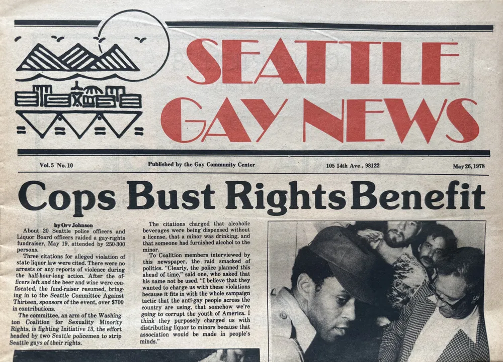 I shared with Chief Barnes a copy of the May 26, 1978, issue of the SGN with the headline “Cops Bust Rights Benefit,” one among many over the years that tackled police brutality. The story reported how 20 SPD officers raided a Gay-rights fundraiser attended by 250-300 people over alleged state liquor code violations. It also mentions Initiative 13, which, according to the article, was an “effort headed by two Seattle policemen to strip Seattle gays of their rights.”