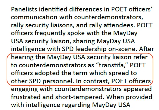 The first question I asked Chief Barnes on the topic of Mayday USA (a religious fundamentalist group from Spokane) was what he thought about the SPD personnel who used the term “Transtifa” (a mashing of Trans and Antifa) to describe counterprotesters.
