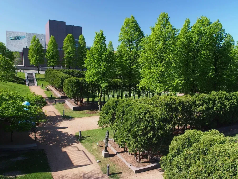 Loring Park and the vicinity also boast an established and lively art scene. The Walker Art Center and its famous sculpture garden are connected to Loring Park by the Irene Hixon Whitney Bridge, created by Iranian American sculptor Siah Armajani, who also commissioned a poem about the bridge by Pulitzer Prize–winning Queer poet John Ashbery. The bridge features two interlocking curved arches meant to resemble a handshake.