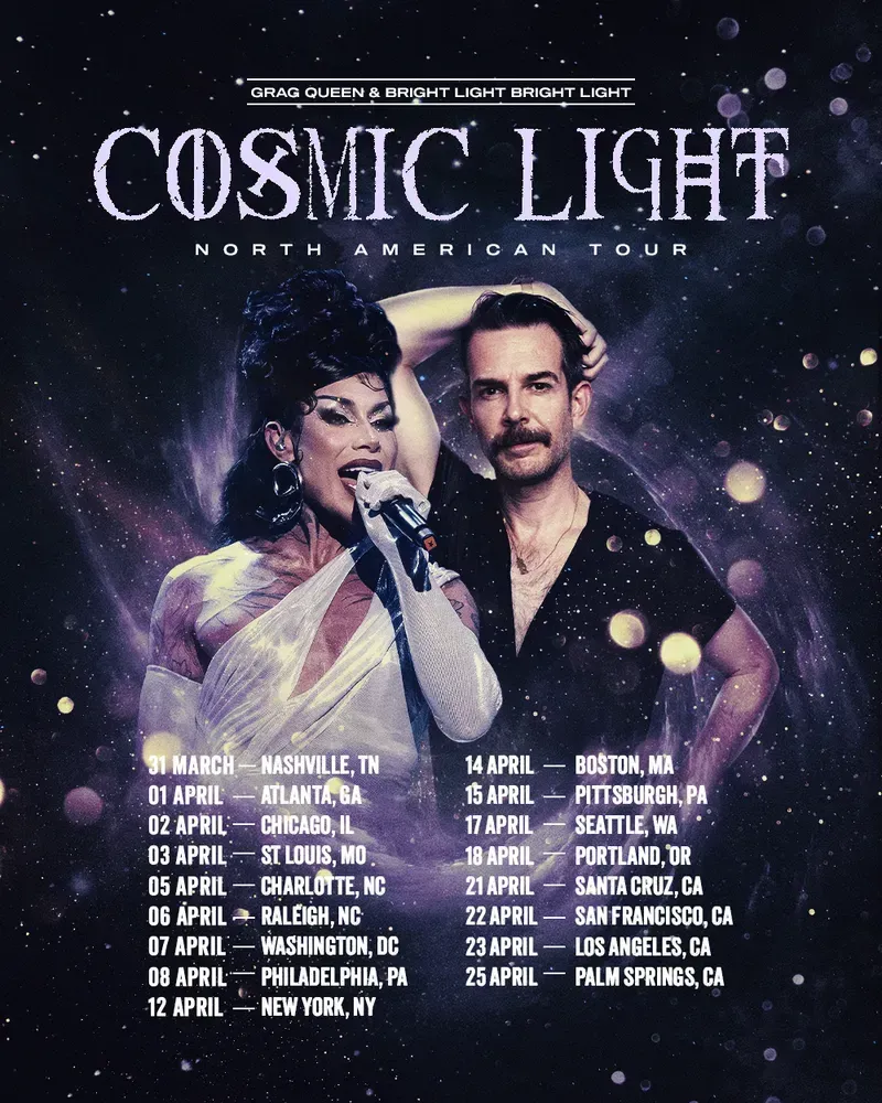Bright Light Bright Light — born Rod Thomas — sounds relaxed, if a little travel-worn, when he joins the call. It’s the middle of a North American tour with drag superstar Grag Queen, a run designed to celebrate Queer joy across 17 cities. By the time they reach Seattle’s Barboza club on April 17, [they’ll be] already deep into the rhythm of the road — throat tea in hand, allergies, and all the “glamour” that touring brings.