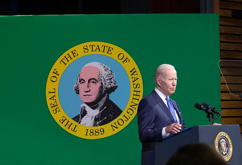 Biden strolled onto the stage amid a fanfare of patriotic tunes blasting from the auditorium speakers. With Graceffo proudly standing at his side, he thanked her, the Washington congresswomen, and Gov. Inslee for their warm welcome and nonstop dedication to the people of Washington.