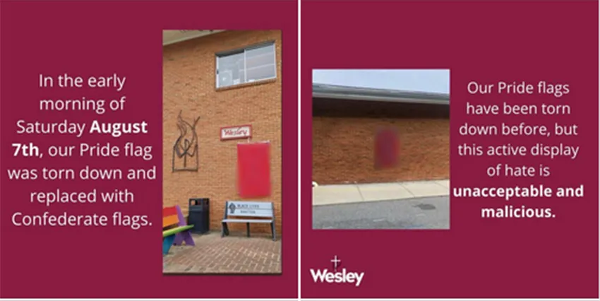 The rainbow flags were originally hung outside the Virginia Tech religious center, a symbol of peace and acceptance from an institution traditionally reluctant to accept homosexuality. Despite this, homophobic tensions are still very present in the community. Over the last two weeks, Pride flags have been stolen from the religious center three times. However, after the latest incident, the vandals responsible left a calling card: two Confederate flags ominously floating in the wind.