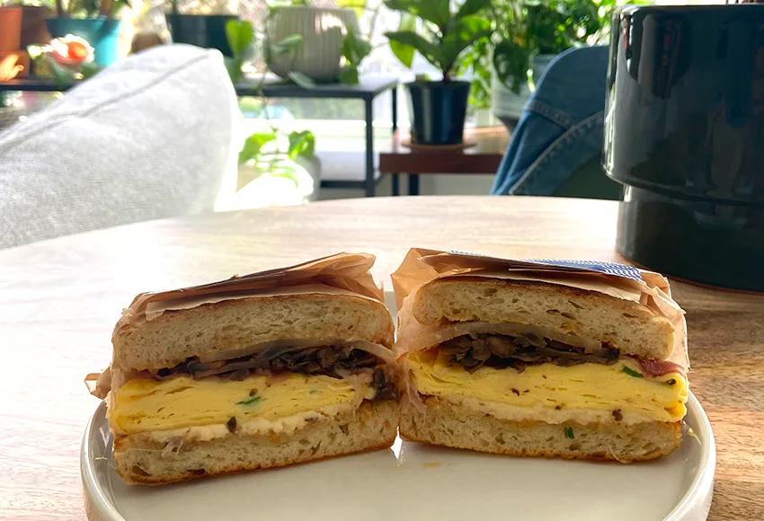 On developing the recipe, Hanlon explained, "We like the English muffin as a base for the egg sandwich, because it's easy to hold and eat, aside from being delicious." The owners also "wanted a flavorful sauce, and wanted the crunch and acid from a pickle," resulting in the use of charred onion aioli and a daikon pickle: as a mild radish, daikon provides a meatier crunch than a classic dill pickle and doesn't overwhelm the palate.