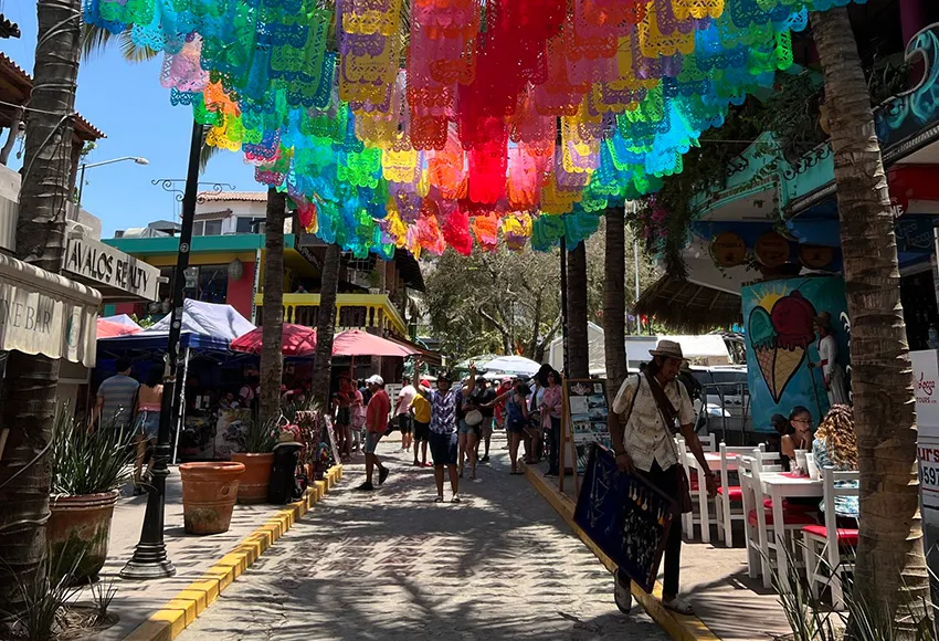 Rainbows of papel picado, perforated paper folk art, form a canopy of vivid color over the streets near the main plaza and the beach. Underneath them, yellow churro stands, family-style restaurant seating, and sky-blue surf shops await.
