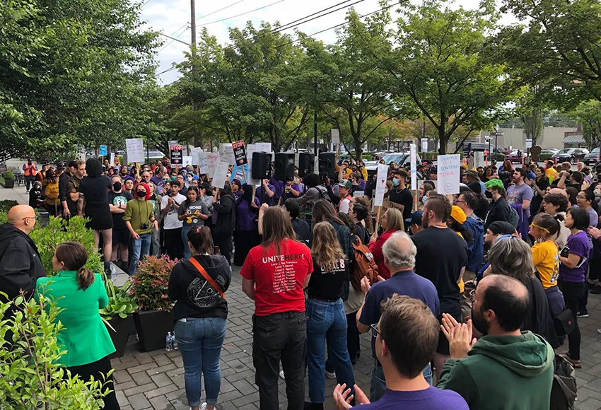 Starbucks workers turned the company's annual Investors Day into a show of strength and community support for their union with a rally and picket at Starbucks corporate headquarters on September 13.