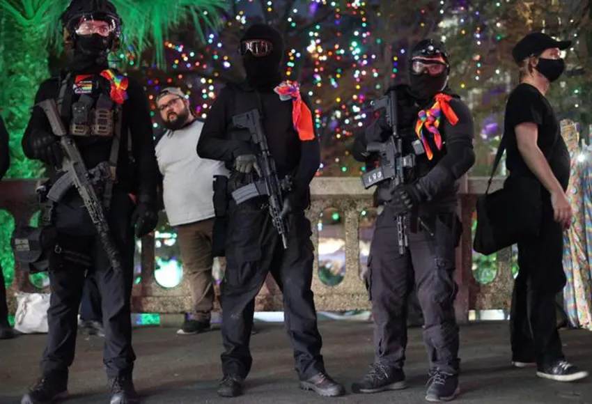 A small group of armed people dressed in black also stood on the pro-LGBTQ side of the street wearing rainbow scarfs tied to their tactical vests. While they declined to speak to reporters, one confirmed that they were members of the John Brown Gun Club, a left-wing gun rights group.