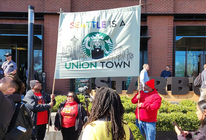 Hundreds of Starbucks workers and supporters from other unions rallied in front of Starbucks corporate headquarters at First Avenue and Lander Street on March 22.
