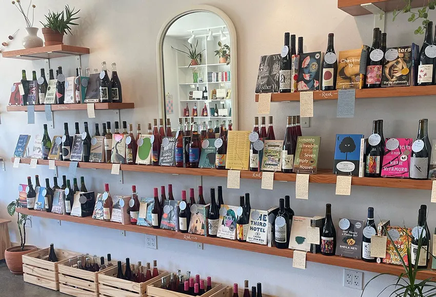 The books are categorized in the store based on the beverages they pair best with. "For the most part, I organize by wine," Kent explained. "That's the main shelf – it goes white to red, and I mix in the books as suggested. We have another wall of featured reads that are ever-changing. Right now, I have a bunch of chilled reds and books to pair with them."