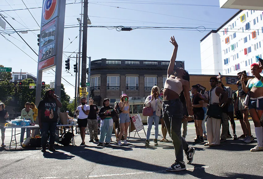 On Friday, August 4, 2023, hundreds of protesters gathered at the 76 gas station on Broadway on Capitol Hill with flowers and signs to mourn the brutal murder of O'Shae Sibley, a Black Gay man stabbed to death at a gas station in New York City. Sibley was stabbed in the chest by an unidentified 17-year-old boy on the night of July 29. He was pronounced dead when he arrived at the hospital. He was only 28.