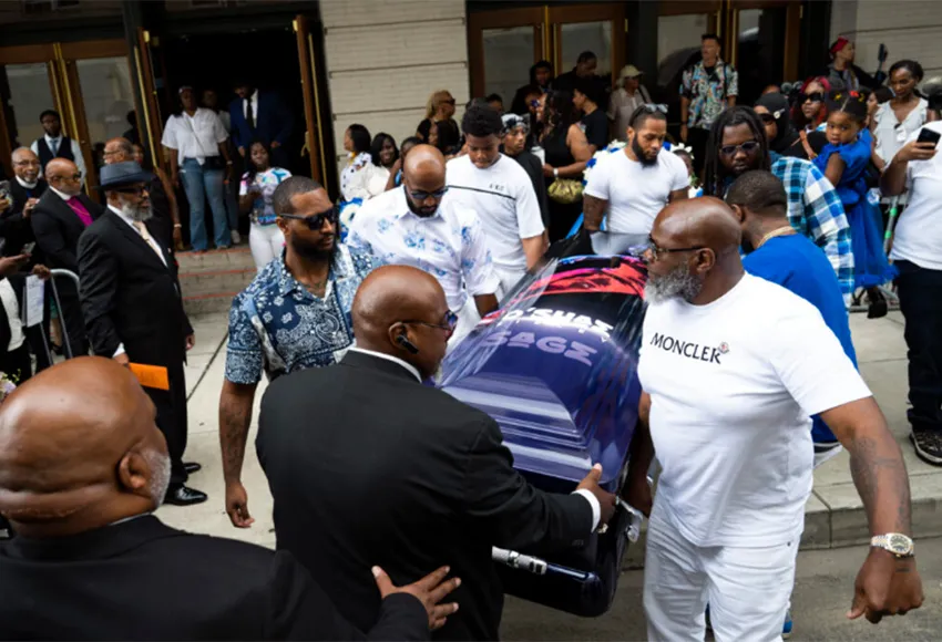 Jack Kelly (r), father to O'Shae Sibley, carries the casket with fellow pallbearers following a celebration of life on Aug. 8, 2023 in Philadelphia, Penn. – Photo by Joe Lamberti / AP