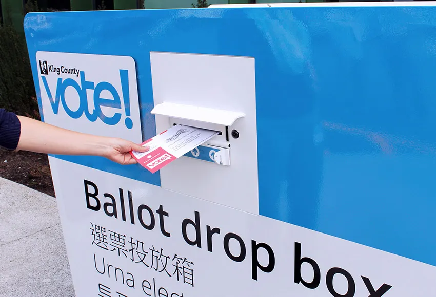 Voters can also drop their ballots in the mail for free (the postage is prepaid) or vote in person at one of six voting centers: Bellevue City Hall, Federal Way City Hall, Kenmore City Hall, Kent Centennial Center, the King County Elections Office, and the Lumen Field Event Center. Voters who have not registered can do so at these in-person voting centers and vote that same day.