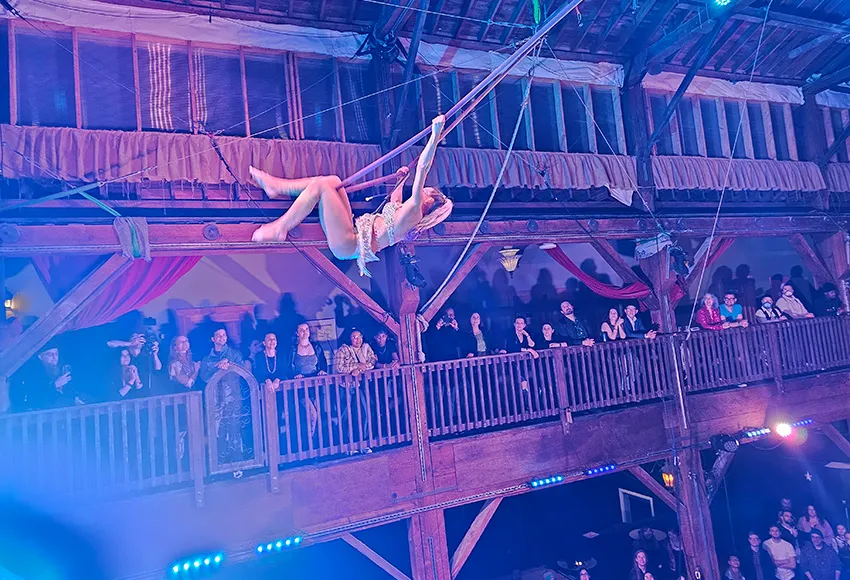 At the Mardi Gras Spectacular debut on February 9, the Emerald City Trapeze Arts venue seemed like a large warehouse or barn, its vaulted ceilings made up of dozens of wooden beams, clearly engineered with aerial activities in mind. Amid the twinkling lights and gentle bustle, every corner below was decorated with an assemblage of esoteric-meets-Mardi Gras: curious potion bottles, glittering skulls, and festive masks. Adults of all ages filled the floor seating and twin balcony spaces.
