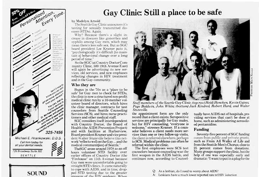 So, from simple, grassroots beginnings in 1979, the Seattle Gay Clinic went on to establish itself as a peer to other Gay-run clinics across the country, rose to the unanticipated challenge of responding to the AIDS epidemic, formed significant partnerships with Public Health of Seattle & King County, and seeded several other vital organizations in the Seattle area.